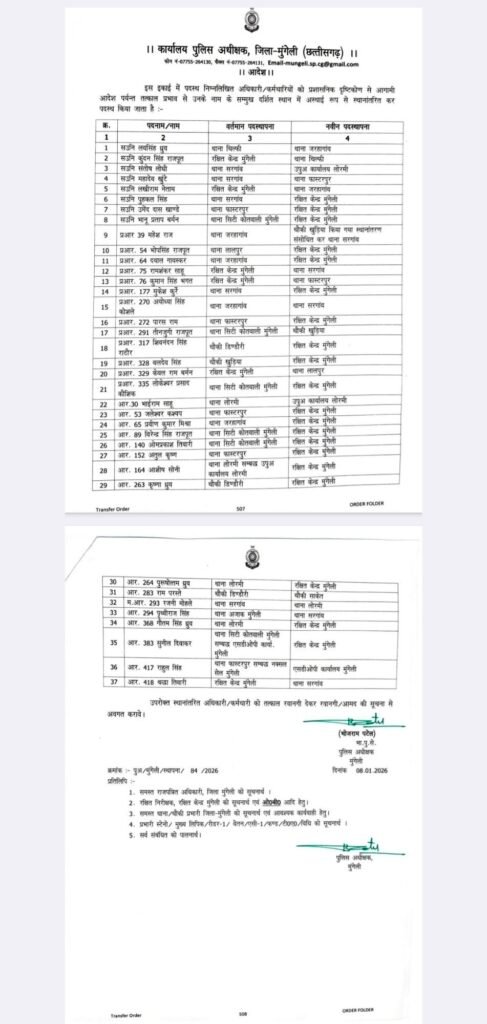 मुंगेली । मुंगेली जिले के पुलिस महकमे में बड़ा प्रशासनिक फेरबदल किया गया है। पुलिस अधीक्षक भोजराम पटेल द्वारा प्रशासनिक दृष्टिकोण से स्थानांतरण आदेश जारी किए गए हैं। जारी सूची के अनुसार जिले के विभिन्न थानों में पदस्थ थाना प्रभारी, उप निरीक्षक, सहायक उप निरीक्षक, प्रधान आरक्षक एवं सिपाही सहित कुल 45 पुलिसकर्मियों का स्थानांतरण किया गया है।